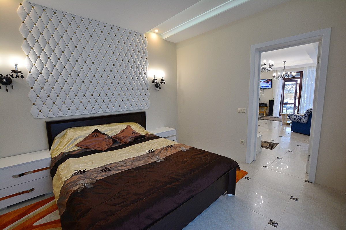 Гостевой дом – это стильный интерьер с французскими окнами до пола и видом на ухоженную территорию с прудом, водопадом и красивыми растениями. Дом включает в себя спальню и гостиную, кухню, финско-русскую баню, парную и бассейн. Все помещения оснащены теплыми полами.