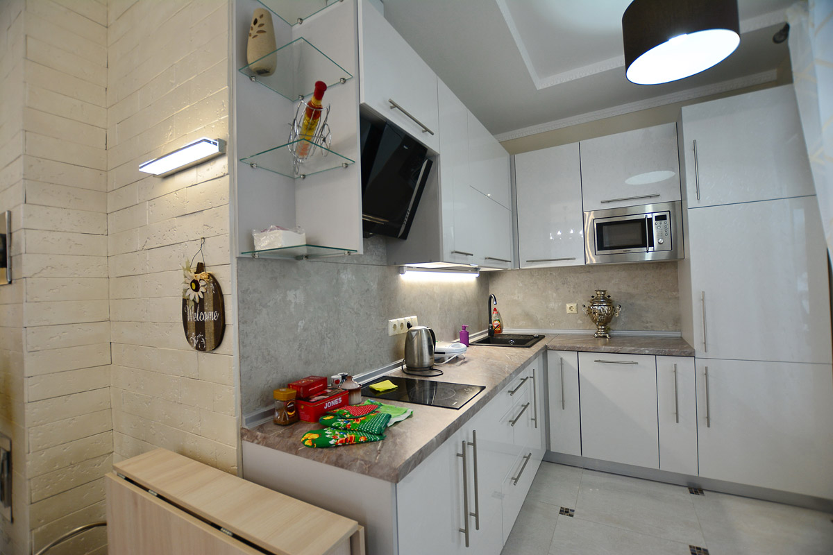 Кухня с посудой, плитой, холодильником, посудомоечной машиной, чайником, тостницей.